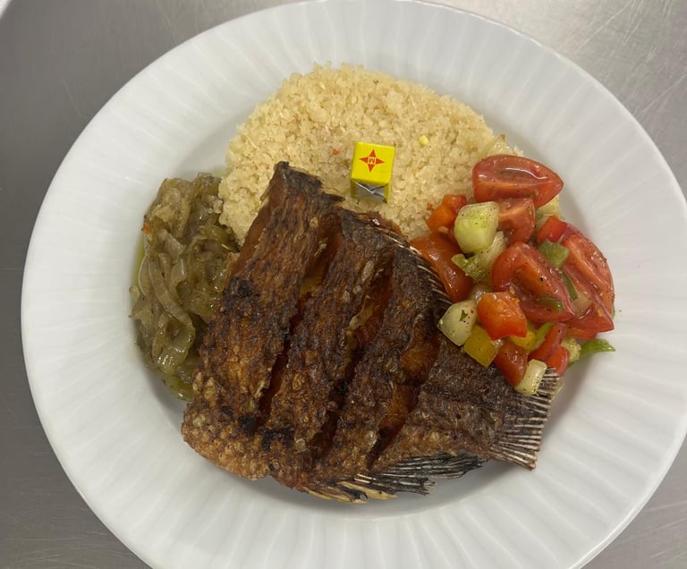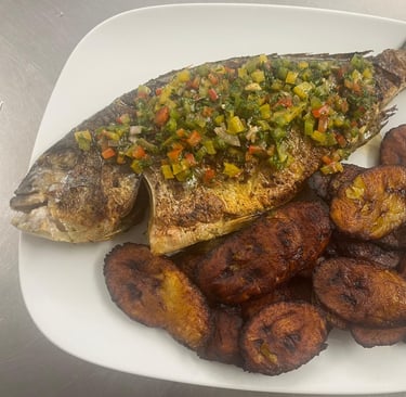 Daurade fraiche entière marinée à l’africaine et braisée avec accompagnement au choix (riz blanc, frites pomme de terre ou patate douce ou banane plantain)