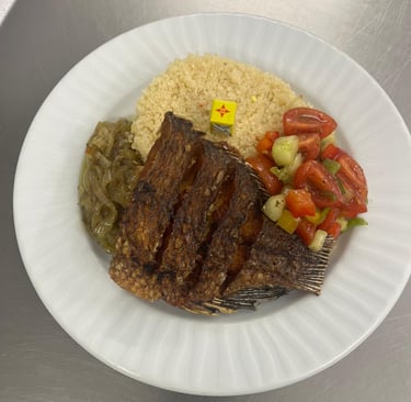 Poisson (en fonction de l’arrivage) ou poulet mariné servi avec attieke (semoule de manioc) et ses petits légumes.