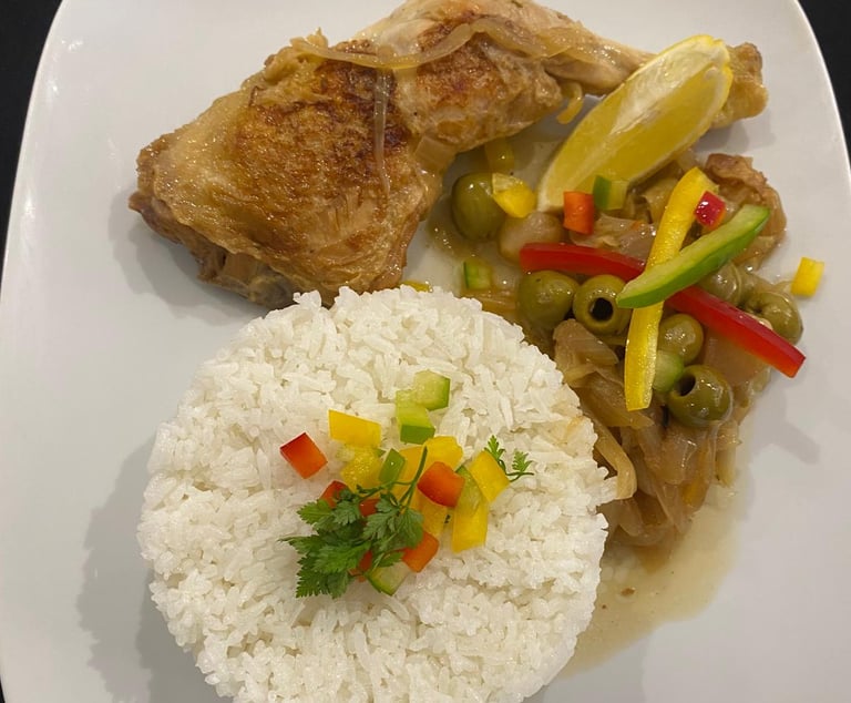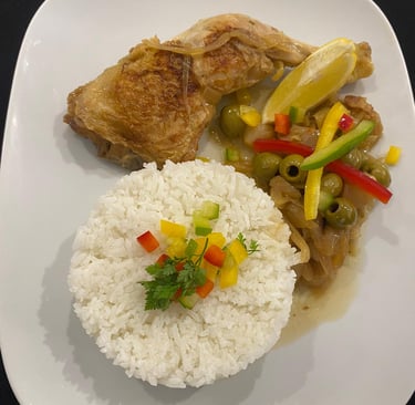 Poulet mijoté, accompagné d’une sauce avec des oignons olives vertes servi avec du riz blanc.