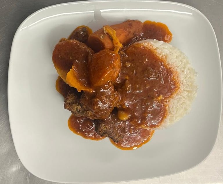 Riz jaune ou rouge, viande de veau ou bœuf mijotée et ses petits légumes.